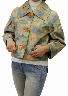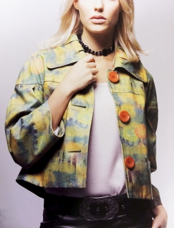 襟やそでに入れたタックが短い丈のジャケットをバランスよく仕上げています。襟のタックはプリントに柄を立体的に見せ華やかな雰囲気に。オレンジの大きなボタンが全体のバランスをまとめるポイントになってます。