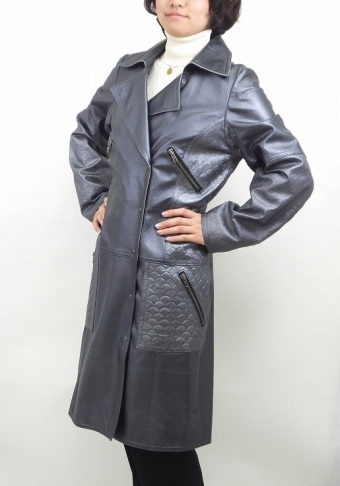レザーのロングトレンチコート。組み合わせている型押しは同じレザーを使ってスタイリッシュに仕上げています。ファスナー使いのポケットは全体がバランスよく見える効果もあります。前奥のファスナー開きがすっきりとしたシュリエットに見せてくれます。