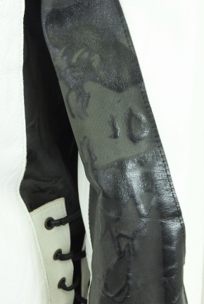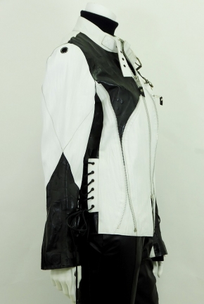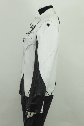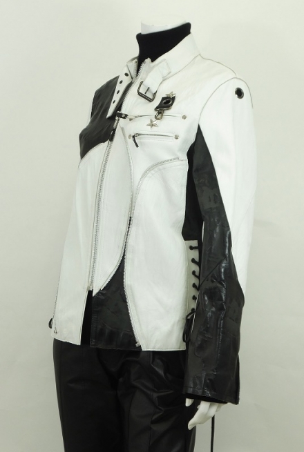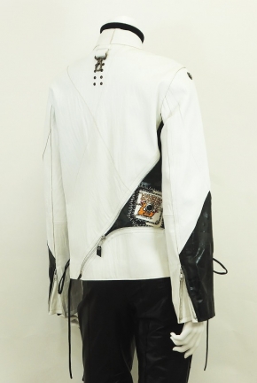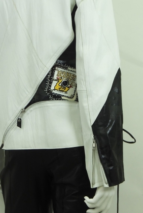 レトロチックなブラック&ホワイトにシルバーのジッパー&ビジョーでアクセントをつけた60年代調のジャケット!ブラックレザーには1940年頃の往年の美しい女優たちの姿がプリントされてサイドに施したレザーのコード使いはどこかプレスリーを連想させます。このモードが好きな方大変お買得です!
