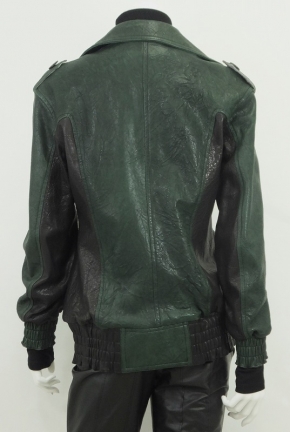 ハードになりがちなテーラーカラーのブルゾンですがエンボスで柔らかなテクスチャーな仕上りに。重くなりがちな濃い色も明るいストライプ柄で軽快な感じにしてくれてます。見た目よりかなり柔らかな革であるのはシャーリングが証明します。