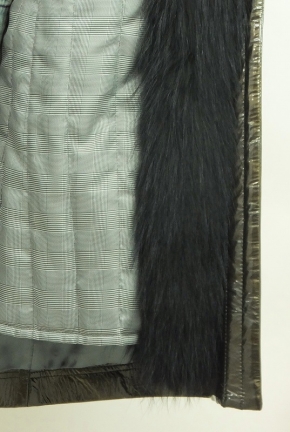 グレンチェックがらの裏地は中綿キルティングでラクーンのファーが襟と前端に施されてます。色の表記がグレーとありますがカーキ味のあるグリーンでラミネート加工されているので玉虫いろの表情も見せます。ロングコートなので手に取った時の重さはありますが着用されますとそれほど感じなくなります。ハードな雰囲気が似合う元気な方おすすめです!