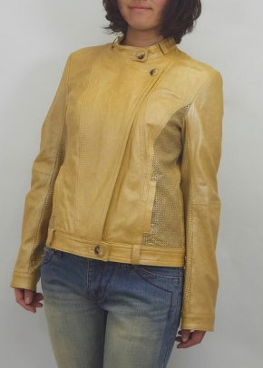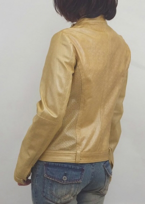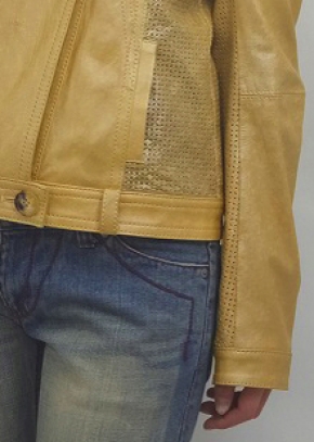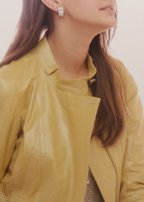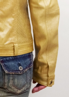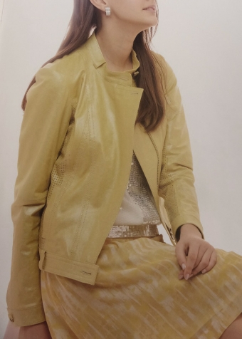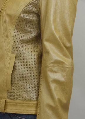 プリント&ワッシャー加工のレザーとそれにパンチング加工したレザーの組み合わせ。素材感がライダースジャケットを優しく仕上げています。フェミニンなスカートにもカジュアルなジーンズにもコーディネート出来てお洒落を楽しめます。