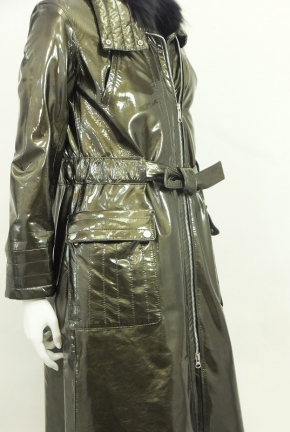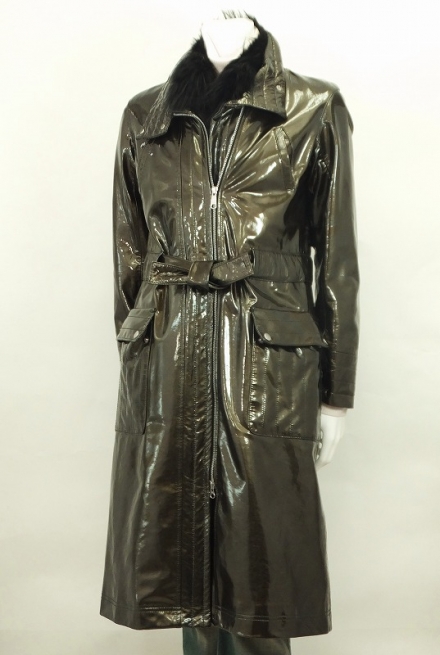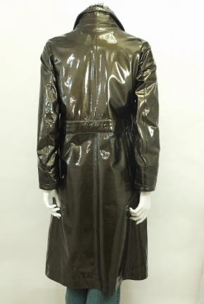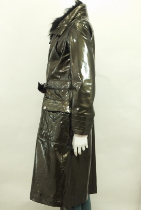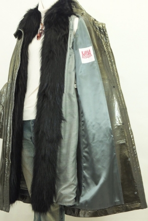 グレンチェックがらの裏地は中綿キルティングでラクーンのファーが襟と前端に施されてます。色の表記がグレーとありますがカーキ味のあるグリーンでラミネート加工されているので玉虫いろの表情も見せます。ロングコートなので手に取った時の重さはありますが着用されますとそれほど感じなくなります。ハードな雰囲気が似合う元気な方おすすめです!