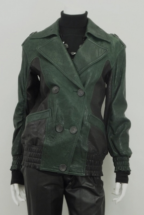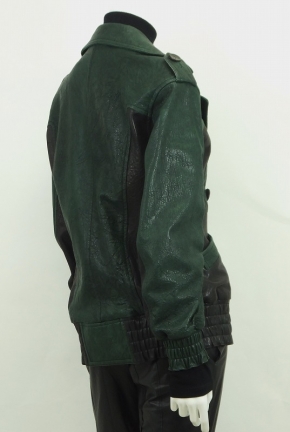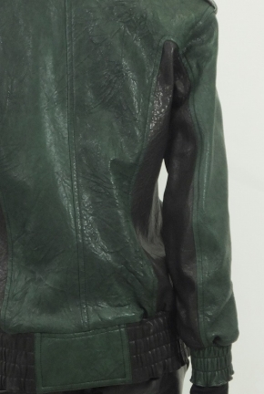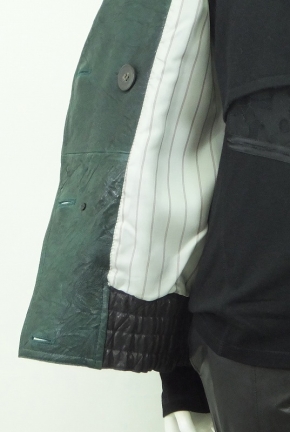 ハードになりがちなテーラーカラーのブルゾンですがエンボスで柔らかなテクスチャーな仕上りに。重くなりがちな濃い色も明るいストライプ柄で軽快な感じにしてくれてます。見た目よりかなり柔らかな革であるのはシャーリングが証明します。
