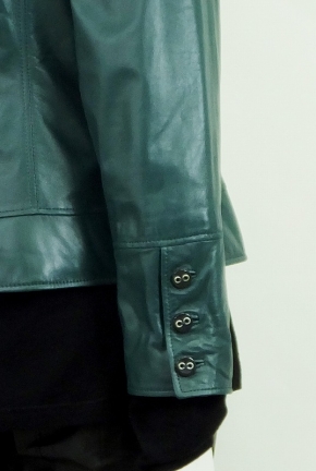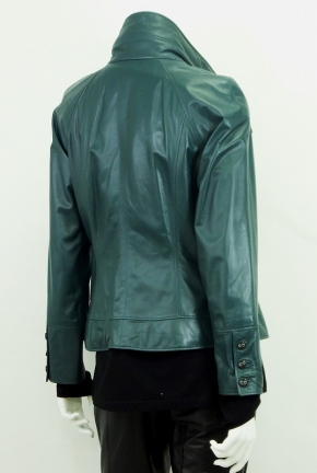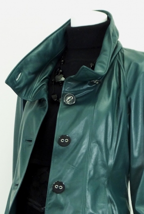 大きな襟がポイントのショートジャケット。襟と裾切り替えにはほんの少しの膨らみを持たせて高級感を出しています。袖口の釦は本あきで裏地はシャンブレーを使って